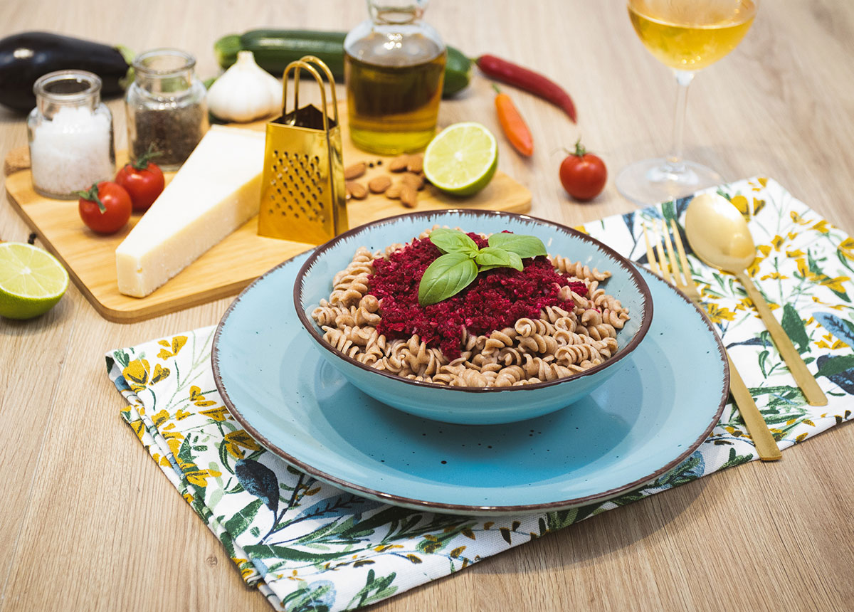 Staviti kuhati tjesteninu u kipuću posoljenu vodu. U multipraktik staviti sve sastojke osim ulja pa usitniti uz postepeno dodavanje ulja. Dodati u vruću tjesteninu i promješati, po potrebi dodati malo vode u kojoj se kuhala tjestenina. Kod serviranja po želji preliti sa malo maslinovog ulja i dodati nekoliko listova bosiljka.